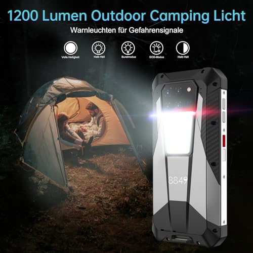 【1200LM Leistungsstarkes Campinglicht】8849 Tank 3 handy outdoor ist mit 1200LM Campinglicht ausgestattet, das eine große Fläche bis 98ft beleuchten kann und eine zuverlässige Lichtquelle für Ihre Outdoor-Aktivitäten bietet. Mit fünf verschiedenen Modi (einschließlich SOS, Explosionsblitz, etwas helles, volles Licht und halbes Licht); Nicht aber das, Tank 3 android 13 Smartphone fügt Warnsignalleuchten für den Notfalleinsatz hinzu, Das macht Ihre Outdoor-Aktivitäten sicherer und bequemer
