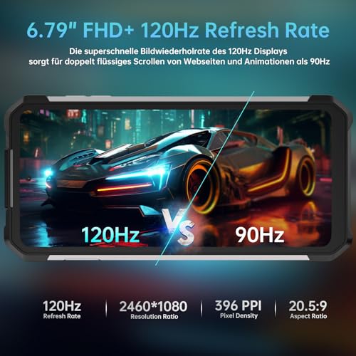【6.79″FHD+ Display & 120Hz Refresh Skonto】8849 Tank 3 Android 13 Smartphone verfügen über ein 6,79″FHD+Display, 1080*2460 hochauflösende Anzeige der adaptiven Bildwiederholfrequenz von 120Hz, um ein äußerst flüssiges tägliches Nutzungserlebnis zu bieten, mit bemerkenswert flüssigerem Scrollen von Webseiten und Animationen in Apps (ACHTUNG: TANK 3 Smartphone besteht aus einem einzigen Lautsprecher, nicht aus zwei Lautsprechern)