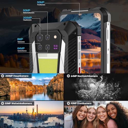 【200MP Hauptkamera+50MP Frontkamera】8849 Tank 3 handy outdoor ohne vertrag mit 200MP Hauptkamera, können Sie Bilder mit bemerkenswerter Klarheit und Details aufnehmen; Die 50MP Frontkamera unterstützt Beauty Selfies; Natürlich, wenn Sie Nachtaufnahmen mögen, kann robuste Smartphone mit verbesserter 64MP-Nachtsichtkamera viele schöne Momente erfassen, die gewöhnliche Telefone nicht erfassen können. Die 50MP Weitwinkelkamera für mehr Sinnesansicht, 8MP Telekamera macht die Fotos künstlerischer