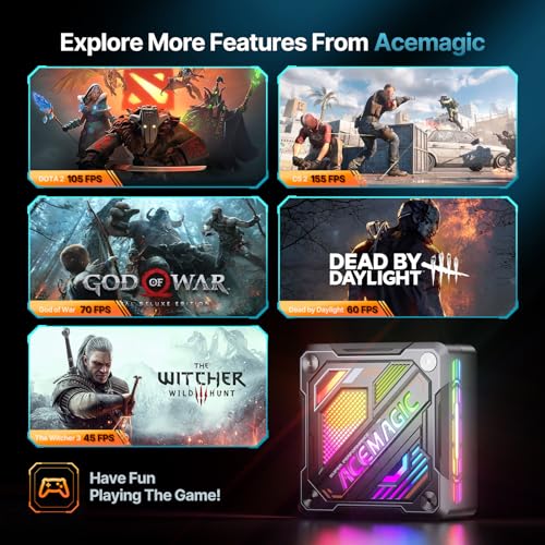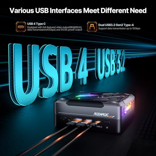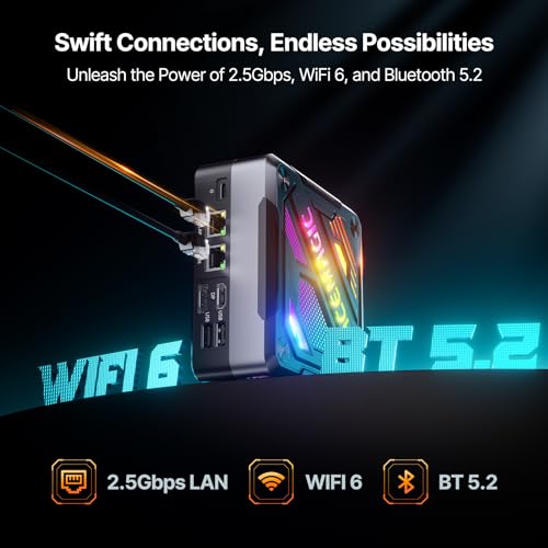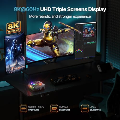 【Multi-Bildschirm-Verbindung, einzigartiger Stil】Dieser Mini-Computer kann an drei Bildschirme angeschlossen werden (HDMI 2.1 + Typ-C + DP 2.0), unterstützt 8K-Anzeige und die visuellen Effekte sind klar und lebensecht. Es verfügt über 5 verschiedene Beleuchtungsmodi: AUTO/AN/BREATH/RAIN BOW/CYCLE, die eine einzigartige visuelle Wirkung und Spielatmosphäre schaffen und Ihnen ein noch intensiveres Spielerlebnis bieten.