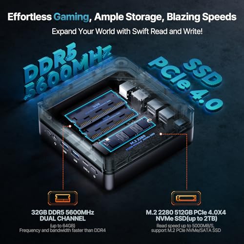 【Leistungsbeschleuniger】Der AM18 Mini-Computer ist mit 16 GB*2 5600 MHz DDR5 (bis zu 64GB) und 512 GB M.2 2280 PCIe4.0 X4 NVMe SSD (bis zu 2TB) mit Lese- und Schreibgeschwindigkeiten von bis zu 5000 MB/s ausgestattet. Die perfekte Speicherkombination aus Dual-Channel DDR5-5600 (Hochfrequenz-Cache) + PCIe4.0X4 NVMe SSD (Hochgeschwindigkeits-Flash-Speicher) sorgt für eine stärkere Leistungsfreisetzung. Es kann Spielebenutzern ein reibungsloses und stabiles Spielerlebnis bieten und professionellen Benutzern eine hervorragende Speicherunterstützung bieten. Dependent mit Zen4 (CPU) + RDNA3 (GPU) kann das Potenzial des Mini-PC zu 100% schäbig werden. Diese Kombination ist sehr leistungsstark!
