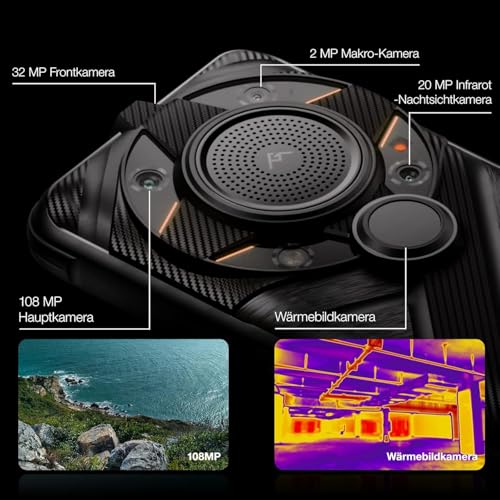 Alleskönner-Kamerasystem: Das robuste Handy AGM G2 Guardian mit Wärmebildkamera besteht aus einer 108-MP-Hauptkamera, einer 32-MP-Frontkamera, einer 20-MP-Infrarot-Nachtsichtkamera und einer 2-MP-Makrokamera. Unsere bisher beste Rückkamera, der 108-MP-Sensor, ermöglicht die grafische Darstellung hochauflösender Bilder mit lebendigen Details.