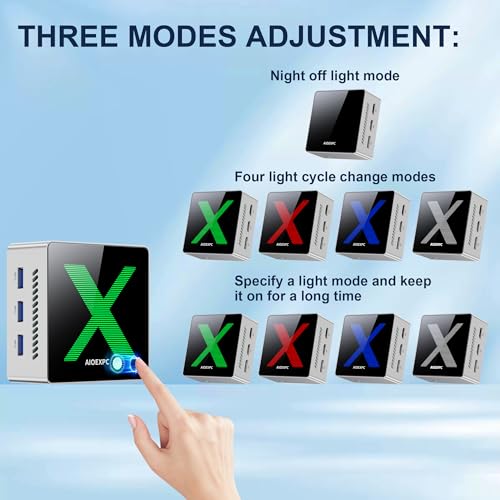 Drei Beleuchtungsmodi :Das X Licht des Mini PC ist eine nette Geste und bietet drei Beleuchtungsmodi: Nachtmodus für eine unauffällige Optik,einen dynamischen Farbwechselmodus und ein gleichmäßiges Leuchten in der von Ihnen gewählten Farbe.Unser Produktlogo kann berührt werden, um den Beleuchtungsmodus zu verarbeiten.