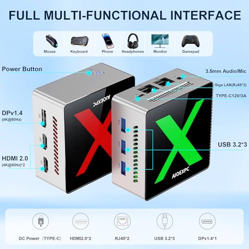 16GB LPDDR5 RAM + 512GB SSD: AIOEXPC Mini PC Schnelle Leistung und Großer SpeicherplatzDer neueste LPDDR5 RAM bietet eine um 35% höhere Geschwindigkeit als DDR4 bei gleichzeitig 25% abzüglich Stromverbrauch,RAM kann nicht erweitert werden,ROM 512GB M.2 SSD 2242 (Erweiterbar auf bis zu 2 TB SSD)