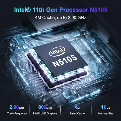 【Schneller Mini-PC】N5105 Mini-PC vorinstalliert mit W11 Pro, und eingebautem schnelleren 11. Lebensabschnitt Intel Celeron Prozessor N5105(4C/4T,4M Cache,bis zu 2,9GHz). Ausgestattet mit Intel UHD Graphics (bis zu 800 MHz) ist er der ideale Desktop-Computer stattdessen die täglichen Aufgaben im Büro. Er läuft reich schneller wie die Chips N5095, N3450, N4020, J3455, J4125, etc.