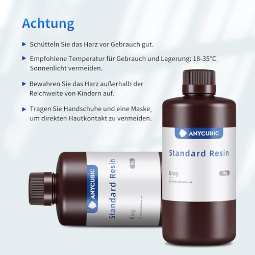 【Hohe Präzision, geringe Schrumpfung】 Anycubic 3D-Harz bietet hohe Genauigkeit, glatte Oberfläche, klare Druckdetails und Vorteile bei der geringen Schrumpfrate für den Modelldruck. Empfohlene Druckparameter: Belichtungszeit des Bodens: ~60s; normale Belichtungszeit: ~8s.