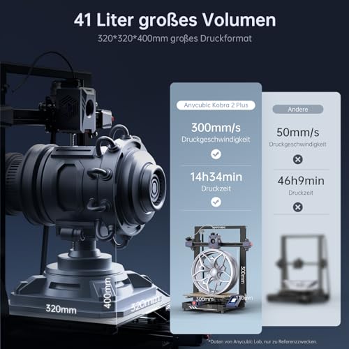 【Große Druckgröße】Anycubic Kobra 2 Plus verfügt über eine beeindruckende Druckgröße von 320*320*400mm, kann Modelle von etwa 41 Litern Volumen mit einem Mal drucken. Der Vertiefung desselben Modells in voller Größe, im Vereinbarung zu ähnlichen Produkten auf dem Marktgebiet mit einer Druckgeschwindigkeit von 50mm/s, verkürzt die Druckzeit um 31 h 35 mins.Es lässt Ihrer Kreativität freien Lauf und entfesselt Ihre Phantasie.
