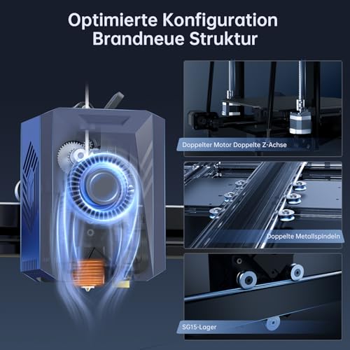 【Optimierte Konfiguration】Durch die Verwendung eines Direktextruders und einer Zweimotoren-Doppel-Z-Achsen-Bewegungsstruktur, die perfekt für die Extrusions- und Kühlsysteme optimiert wurden, werden die Materialien effizient und präzise zugeführt, was ein schnelles Schmelzen und Abschrecken ermöglicht. Dies führt zu einem reibungslosen Betrieb und weniger sichtbaren Schichtlinien.