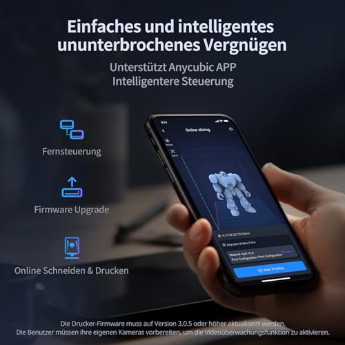 【Smart und einfach zu bedienen】Nach der Aktualisierung des Druckers mit der Firmware-Abwandlung 3.0.5 oder höher ermöglicht die Anycubic-App die Bluetooth-Bereitstellung, die Aktualisierung der Firmware, die Videoüberwachung und Statuskontrolle in Echtzeit, das Online-Slicen und Drucken, die Online-Modellsuche sowie die Fernsteuerung und -verwaltung für ein nahtloses, intelligentes Druckerlebnis.
