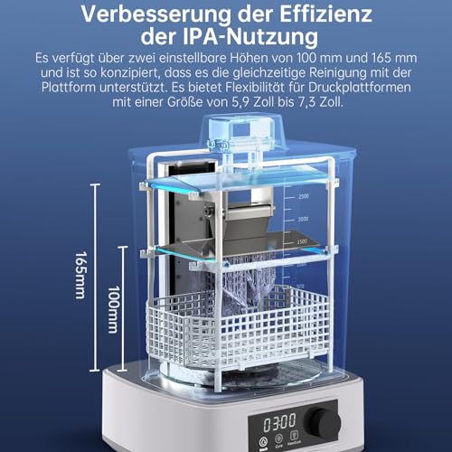 【𝐙𝐰𝐞𝐢𝐥𝐚𝐠𝐢𝐠𝐞𝐬 𝐃𝐞𝐬𝐢𝐠𝐧, 𝐈𝐏𝐀-𝐒𝐩𝐚𝐫𝐞𝐧】 Der doppellagige PP-Materialreinigungskorb ist so konzipiert, dass er die gleichzeitige Reinigung mit der Plattform unterstützt. Er verfügt über zwei einstellbare Höhen von 100 mm und 165 mm, die eine flexible Anpassung an Druckplattformen von 5,9 Zoll bis 7,3 Zoll ermöglichen. Dieses Design maximiert die Effizienz der IPA-Nutzung.