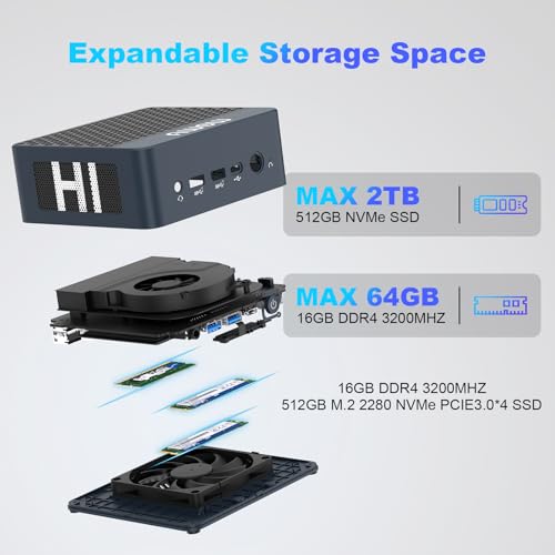 【Erweiterbare Kapazität】Der AWOW HI12 Mini PC verfügt über 16 GB DDR4-Speicher (bis zu 64 GB) + M.2 2280 512 GB PCIe 3.0 SSD-Speicher (bis zu 2 TB), sodass Sie problemlos Filme/Fotos von Digitalkameras in See stechen können, ohne befürchten zu müssen, dass Ihnen der Speicherplatz ausgeht