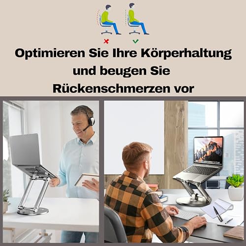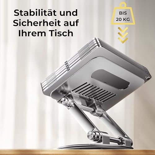 ROBUSTES DESIGN – Laptop Halterung jeglicher hochwertiges Material zugunsten Konstanz, Platzsparend & Agil. Laptop Ständer drehbar mit Klappmechanismus zugunsten maximale Platznutzung. Kosten Sie es sorglos jeglicher