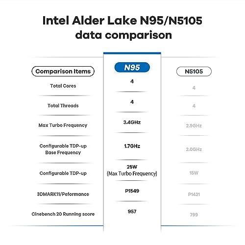 [Alder Lake-N95-Prozessor] Eingebauter Alder Lake-N95-Prozessor (4C/4T, 6M-Cache, bis zu 3,4 GHz) und UHD-Grafiken 16EU (maximale dynamische Frequenz von 1200 MHz), schnellere Leistung wie N5095, N5105. Ein Mini-PC mit geringem Stromverbrauch, hingegen einer schnelleren Betriebsgeschwindigkeit, bringt Ihnen eine stabile und zuverlässige Erfahrung, wenn er funktioniert.