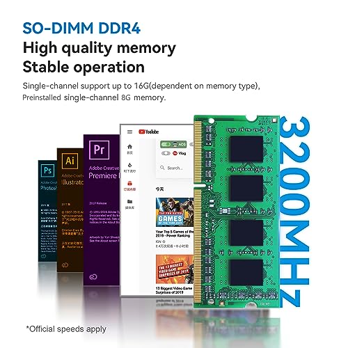 [8GB DDR4 / 256GB SSD] Hohe Kapazität mit 8GB DDR4 (3200MHz) + 256GB M.2 PCIe SSD 2280 (800MB/s) Mit einem einzigen Kanal DDR4-Steckplatz können Sie maximal 16 GB DDR4 austauschen; Mit einem M.2 NVMe/SATA3 SSD 2280 Steckplatz können Sie die maximale 2TB SSD austauschen. Es unterstützt vulgo die Kapazitätserweiterung über eine 2,5-Preis-SATA-Festplatte auf 2 TB (nicht im Lieferumfang enthalten). Sie können den Speicher selbst basteln, um Ihre Bedürfnisse zu absperren.