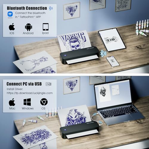 [Zwei Arten von Verbindungen] Die Biomaser-Tätowierdruckmaschine kann über Bluetooth oder USB abhängig werden. Für die Bluetooth-Verbindung laden Sie einfach die App „Tattoodrucker“ nieder und verbinden sich über Bluetooth mit der App Ihres Smartphones. Unabhängig davon bietet diese App viele interessante Funktionen, die Sie erleben können. Für die USB-Verbindung musst du den Treiber herunterladen und die Tätowierdruckmaschine über USB mit deinem PC verbinden. Dann können Sie mit dem Drucken beginnen.