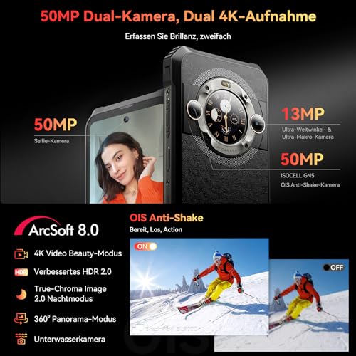 【50MP Doppel-Selfie-Kamera】Die 50 MP OIS-bildstabilisierte Hauptkamera und die 50 MP Selfie-Kamera erfassen jeden Moment kristallklar. Videos werden nicht mehr unscharf, sondern fangen die lebendigen Augenblicke in ihrer vollen Pracht ein. Die 4K-Videoaufnahme bietet kinoreife Klarheit und macht Ihre Erinnerungen lebendig. Zusätzlich gibt es eine 13 MP Ultraweitwinkel- und Makro-Hauptkamera für beeindruckende Naturlandschaften. Der brandneue ArcSoft 8.0 Algorithmus verbessert die Fotoqualität um 18%.
