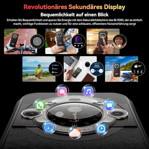 【1.32“ Intelligentes Energiespar-Hilfsdisplay】Das sekundäre Display des BL9000 bietet Bequemlichkeit und spart Energie, sodass Sie Schlüsselfunktionen mühelos nutzen können. Es ermöglicht die Spielart von Zifferblättern, erleichtert das Annehmen von Anrufen, das Überprüfen von Benachrichtigungen, das schnelle Kontrollieren des Wetters, das Hören von Musik, das Öffnen des Kompasses und mehr. Das energiesparende Hilfsdisplay gewährleistet, dass Sie auch in Notfällen in Verbindung bleiben können, und maximiert die Verbindungsdauer bei minimalem Energieverbrauch.