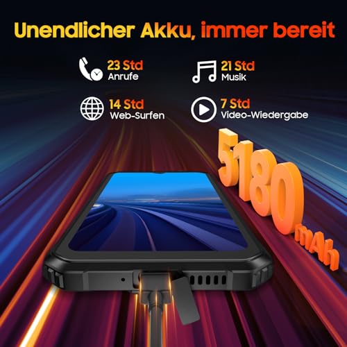 🔋🔋【𝟱𝟭𝟴𝟬𝗺𝗔𝗵 𝗕𝗮𝘁𝘁𝗲𝗿𝗶𝗲 & 𝗥𝗲𝘃𝗲𝗿𝘀𝗲 𝗖𝗵𝗮𝗿𝗴𝗲 𝗢𝗧𝗚】Mit seiner 5180 mAh Batterie und adaptiven Energieverwaltung bietet das rugged smartphone hervorragende Akkulaufzeit und verlängert die Lebensdauer Ihres Akkus. Bis zu 23 Stunden Anrufe, 21 Stunden Musik und 7 Stunden Video. Die Reverse Charge OTG-Überführung lädt Ihre Kopfhörer, Smartwatches und andere Geräte auf. Ideal für Ihre Outdoor-Spannung.