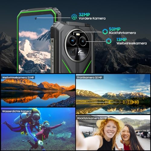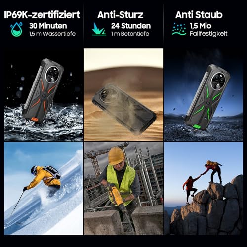 🔨🔨【𝐑𝐨𝐛𝐮𝐬𝐭 𝐮𝐧𝐝 𝐠𝐞𝐞𝐢𝐠𝐧𝐞𝐭 𝐟ü𝐫 𝐫𝐚𝐮𝐞 𝐔𝐦𝐠𝐞𝐛𝐮𝐧𝐠𝐞𝐧! 】Erfüllt die Normen IP68, IP69K und MIL-STD-810H, was bedeutet, dass dieses wasserdichte handy bis zu 1,5 Meter untergetaucht werden kann, Strahlwasser bei 80°C und Stürze aus 1,2 Metern übersteht, ohne dass das unzerbrechliche Telefon Spuren hinterlässt. Der Rahmen aus einer Aluminiumlegierung und die gummierten Ecken verleihen ihm einen robusten Stil und machen es ideal für Outdoor-Aktivitäten, Glücksjäger, Radfahrer, Motorradfahrer und Angler
