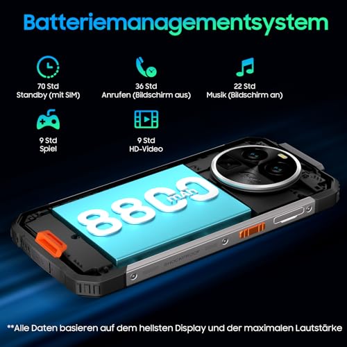 🔋🔋𝟖𝟖𝟎𝟎𝐦𝐀𝐡 𝐀𝐊𝐊𝐔 &𝟒𝟓𝐖 𝐒𝐂𝐇𝐍𝐄𝐋𝐋𝐋𝐀𝐃𝐔𝐍: Blackview BV8100 Outdoor Handy ohne Einigung ist mit einem 8800mAhgroßen Akku ausgestattet und unterstützt 33W Schnellladung. Es dauert ungeachtet 77 Minuten, um 70% aufzuladen, und es kann in dreieinhalb Stunden vollständig aufgeladen werden. Es hat eine Standby-Zeit von bis zu 37 Tagen und eine kontinuierliche Internetzeit von bis zu 16 Stunden. Blackview outdoor handy android 14 Ideal für Expresszustellung, Autoreparatur, Bauarbeiter, Outdoor-Wandern, Angeln, Camping usw.