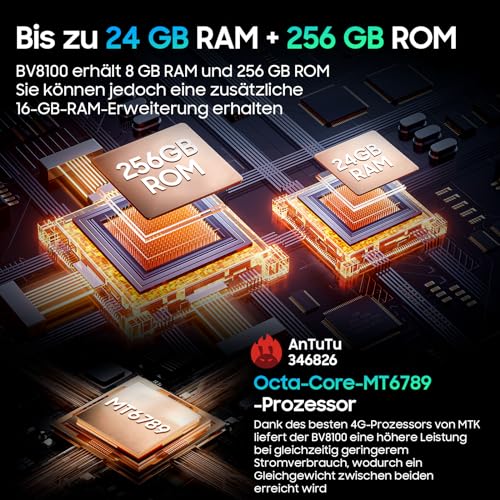 🚀🚀𝟐𝟒𝐆𝐁 𝐑𝐀𝐌 + 𝟐𝟓𝟔𝐆𝐁 𝐑𝐎𝐌 & 𝐇𝐞𝐥𝐢𝐨 𝐆𝟗𝟗 𝟔𝐧𝐦: Blackview BV8100 outdoor handy angetrieben durch einen Octa Core G99 6nm Prozessor, erweiterbar auf bis zu 24 GB RAM (8 GB RAM + 16 GB Erweiterung), ermöglicht er einen schnelleren Datenzugriff, ermöglicht effizientes Multitasking und senkt die Kosten bei der Verarbeitung anspruchsvoller Aufgaben. Verzögerung. Mit 256 GB riesigem Speicher können Sie alle Ihre Lieblingsinhalte, Lieblingsfilme, Spiele und Tools zum BV8100 hinzufügen16