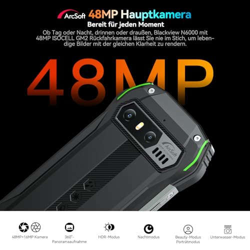 📸【𝐅𝐨𝐥𝐠𝐞𝐧 𝐒𝐢𝐞 𝐈𝐡𝐫𝐞𝐦 𝐤𝐫𝐞𝐚𝐭𝐢𝐯𝐞𝐧 𝐑𝐡𝐲𝐭𝐡𝐦𝐮𝐬】Blackview N6000 Mit einer 48MP ISOCELL GM2 len können Sie getrost lebendige Bilder absorbieren, egal ob bei Tag oder Nacht. Die TetraPixel-Technologie sorgt für außergewöhnliche Lichtempfindlichkeit. Der Re-Mosaik-Algorithmus der 16-MP-Frontkamera und das Quad-Bayer-Farbfilter-Array Acht geben hohe Farbgenauigkeit. Die neuesten ArcSoft 5.0 Algorithmen bieten verbessertes HDR, 2K-Videoaufnahmen, Professional Mode, 360° Panorama Mode und vieles mehr!