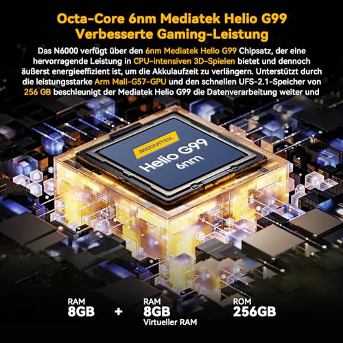 🚀【𝐁𝐢𝐬 𝐳𝐮 𝟏𝟔𝐆𝐁 𝐑𝐀𝐌+𝟐𝟓𝟔𝐆𝐁 𝐑𝐎𝐌, 𝐇𝐞𝐥𝐢𝐨 𝐆𝟗𝟗 𝐏𝐫𝐨𝐳𝐞𝐬𝐬𝐨𝐫】Das N6000 Small Phone ist mit dem MediaTek Helio G99 ausgestattet, der eine Spitzenfrequenz von 2,3Ghz erreicht, und einem Vierfach-Kühlsystem, das die Körpertemperatur um bis zu 15°C reduziert, erleben Sie außergewöhnliche Leistung beim Spielen. Außerdem erweitert die innovative 1:1-Speichererweiterungstechnologie den ursprünglichen 8-GB-Speicher auf 16 GB. 256 GB ROM