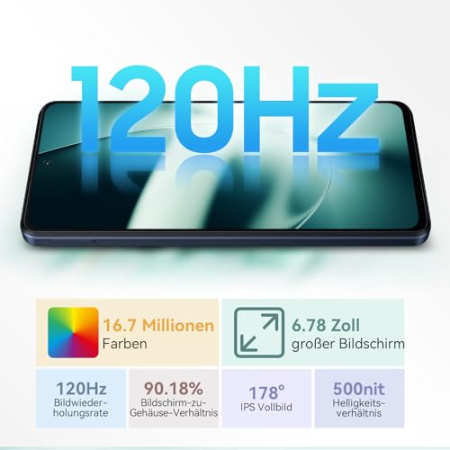 💎【𝟏𝟐𝟎𝐇𝐳 𝟐.𝟒𝐊 𝐓𝐨𝐩 𝐃𝐢𝐬𝐩𝐥𝐚𝐲】Das Blackview-Smartphone verfügt über einen 6,78″Bildschirm mit extremen extremen Rahmen, zusammen mit 178° vollem Blickwinkel, bringt breitere Sicht und weniger Einschränkung im Genuss. 2.4K Smartphone hat eine Auflösung von 1080*2460, der Display ist in der Lage, 16,7 Millionen Farben zu reproduzieren, Bilder mit feineren Details anzuzeigen. Dynamische Bildwiederholfrequenz, 0-120hz passt sich automatisch an, bietet ein flüssigeres Erlebnis und weniger Stromverbrauch