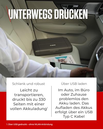MOBILER DRUCKER FÜR UNTERWEGS – Der PIXMA TR150 ist schlank, leicht und robust. Ideale Voraussetzungen für das mobile Büro. bis zu 330 Seiten kann man mit einer vollen Akkuladung drucken, und im Büro, zu Hause oder unterwegs kann man den Stromspeicher Vulgo über ein USB-Kabel vom Typ C abermals aufladen. Zuverlässiges Drucken für Randlosfotos und Dokumente bis zum Format A4. Mit einer Druckgeschwindigkeit von 9 ISO-Seiten/Minute in S/W und 5,5 ISO-Seiten/Minute in Farbe arbeitet der Drucker leise und schnell