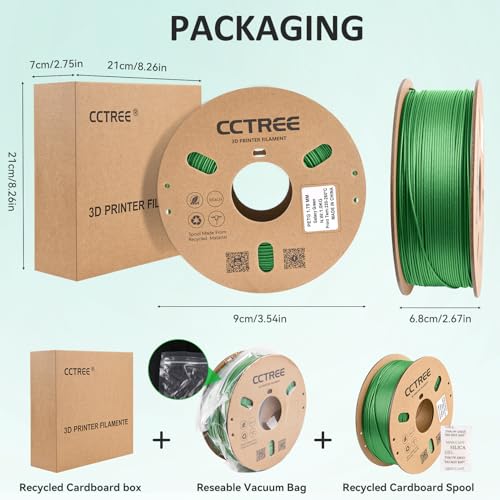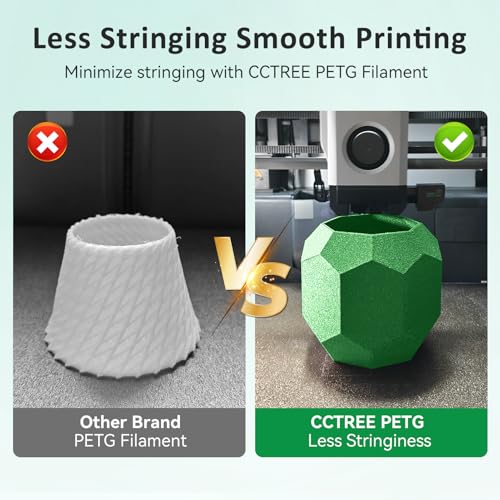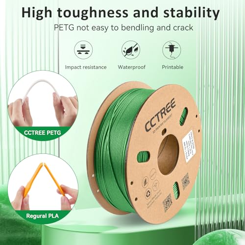 CCTREE PETG 3D Printer Filaments are using 100% virgin and environmental friendly resin and colorants. CCTREE does not include any cheap plastic fillers or regrind. The filament is vacuum sealed with desiccant to protect it from moisture. The printing temperature of PETG is higher than PLA. Be sure to print with a heating bed, and in a well-ventilated space.
