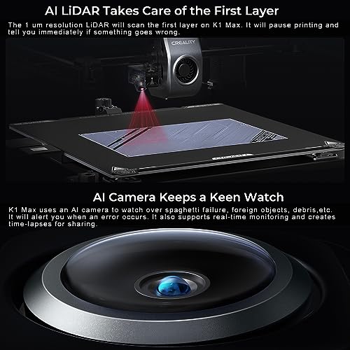 AI-UNTERSTÜTZTES SORGENFREIES DRUCKEN: Mit einem LiDAR-Sensor mit einer Zertrennung von 1μm scannt der K1 Max automatisch die erste Schicht. Bei Problemen wird der Druckvorgang pausiert und Sie werden unverzüglich benachrichtigt. Darüber hinaus überwacht der K1 Max mit einer Kamera mithilfe von AI-Technologie Fehler wie Verstopfungen, Fremdkörper oder Ablagerungen und reagiert sinnvoll. Es unterstützt alias Echtzeitüberwachung und ermöglicht die Erstellung von zeitverzögerten Freigaben.
