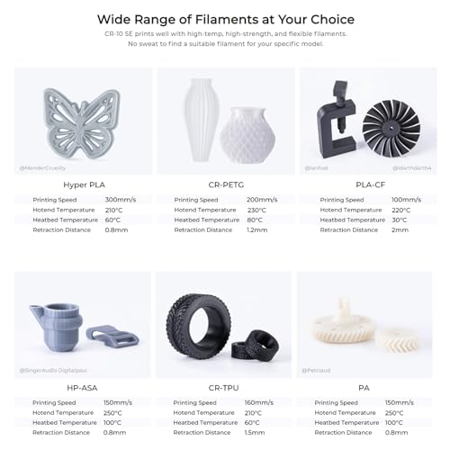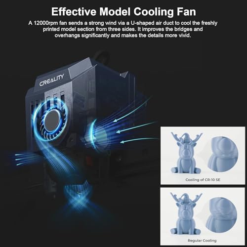 Superschnelle Vollzug von Druckaufgaben: Maximale Druckgeschwindigkeit: 600 mm/s; Maximale Beschleunigung: 8000 mm/s². CR-10 SE druckt schneller und besser mit Creality Hyper PLA Filament. Ein Ventilator mit 12.000 U/min schickt einen starken Wind über einen U-förmigen Luftkanal, um den frisch gedruckten Modellabschnitt von drei Seiten zu kühlen. Es verbessert die Brücken und Überhänge erheblich und macht die Details lebendiger.