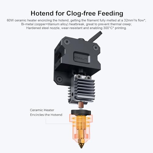 Hotend für verstopfungsfreie Zuführung: 60-W-Keramikheizung umgibt das Hotend und sorgt dafür, dass das Filament bei einem Durchfluss von 32 mm³/s lückenlos geschmolzen wird; Bimetall-Wärmeschutz (Kupfer+Titan-Legierung), ideal zur Abwendung von thermischem Kriechen; Düse aus gehärtetem Stahl, verschleißfest und ermöglicht das Drucken bei 300 °C*.