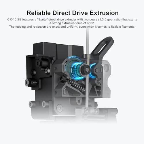 Zuverlässige Extrusion mit Direktantrieb: Creality CR-10 SE verfügt über einen „Sprite“-Extruder mit Direktantrieb und zwei Zahnrädern (Übersetzungsverhältnis 1:3,5), der eine starke Extrusionskraft von 65 N ausübt. Auch bei flexiblen Filamenten erfolgt der Vorschub und Abbestellung exakt und gleichmäßig.