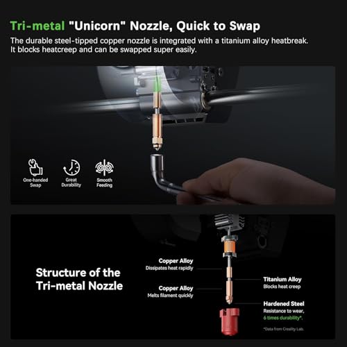 【Direkte Extrusion mit voller Leistung】Das Direct-Extruder-Kit wird durch eine Verstärkfeder und einen Kugeldrücker für mehr als 1000 Stunden verstopfungsfreien Extrusionsbetrieb verbessert. Die Düse und der Heatbreak sind als Einheit vereint, um Wärmestau zu verhindern und einen einfachen Austausch zu gewährleisten. Außerdem umschließt ein 60-W-Keramikheizkörper den Hotend, um Antiblockiersystem, PETG, PLA-CF und andere Hochtemperatur-Filamente unterwegs lückenlos zu schmelzen.