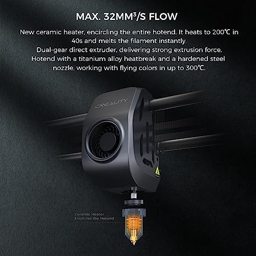6. HOTEND-UPGRADE FÜR HOCHTEMPERATURDRUCK: Heatbreak aus Titanlegierung des Creality K1 Max All-in-One-3D-Druckers. Geringe Wärmeleitfähigkeit zur Blockierung von Wärmekriechen. Kann bis zu 300℃ zähmen. Gewellter Kühlkörper: 2,5-fache Oberfläche, die durch einen leisen Axialventilator schnell luftgekühlt wird. Große Schmelzkammer: 50 mm³ Schmelzkammer, umgeben von einem großen 4000 mm³ Heizblock.