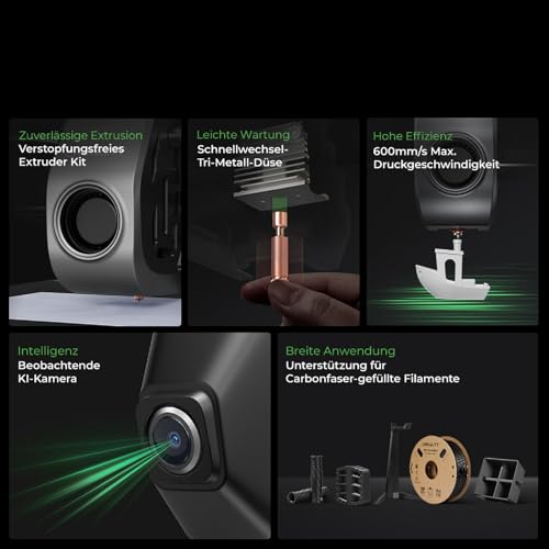 CoreXY, 600mm/s Hochgeschwindigkeitsdruck – Creality K1C 3D Drucker übernimmt das leichte und agile CoreXY-System des K1. Er hat eine maximale Geschwindigkeit von 600 mm/s und eine Antritt von 20.000 mm/s und ist vibrationsfest. Der dynamisch ausbalancierte Druckkopflüfter kühlt das heiße Abschluss und ermöglicht 3D-Drucke ohne Erschütterungen.