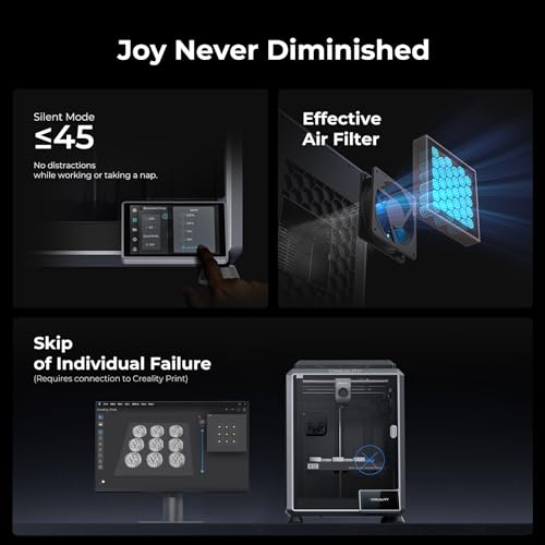 [Al Kamera, Luftfilter und lautloser Modus] Die Kamera des K1C Druckers kann den Druckvorgang überwachen und Sie aktiv benachrichtigen, wenn ein Fehler auftritt. *Auch ideal für Videoüberwachung und Zeitrafferaufnahmen. Der Luftfilter reinigt Verbindungen und Partikel, die aus geschmolzenen Filamenten entstehen. Der Silent-Modus reduziert den Lärm auf 45 dB.