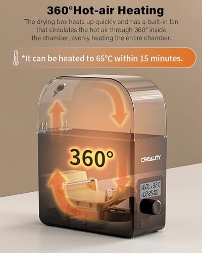 🔥Schnelles & Gleichmäßig Aufheizen🔥 Der Creality 3D-Drucker-Filamenttrockner kann innerhalb von 15 Minuten auf 65° erhitzt werden, und der eingebaute Ventilator zirkuliert die warme Luft durch 360° im Inneren der Kammer. Dies hilft, Verziehen und Risse aufgrund ungleichmäßiger Erwärmung zu vermeiden und Ihre Bericht perfekter und glänzender zu machen.