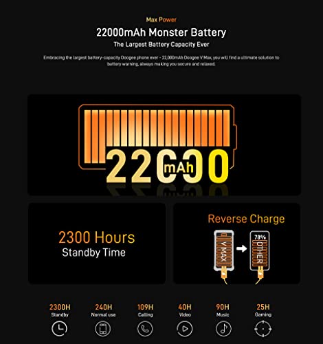 ★【Max Power 22000mAh Monster-Akku, die größte Akku-Kapazität aller Zeiten】Mit der größten Akku-Kapazität aller Zeiten bei Doogee-Handys – 22.000mAh von Doogee V Max, finden Sie eine ultimative Lösung für Akku-Warnung, damit Sie immer sicher und entspannt sind (2300 Stunden Standby-Zeit, Gegenladung, 40 Stunden Videowiedergabe, 240 Stunden Normalbetrieb, 33W Schnellladung).