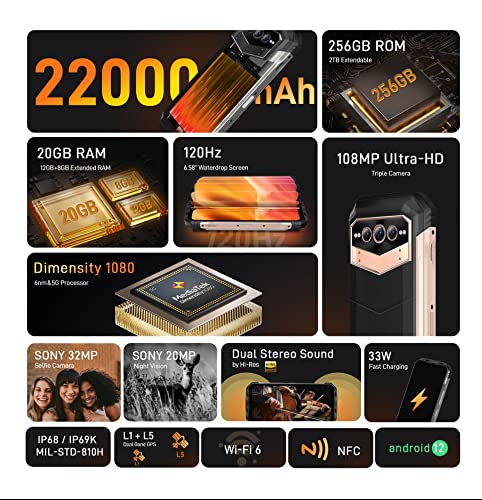 DOOGEE 5G Outdoor Smartphone ohne Vertrag VMAX, 22000mAh Akku, Dimensity 1080 Octa Core 12GB+256GB, 6.58“ 120Hz FHD+, 108MP Triple AI Kamera(20MP Nachtsicht), Android 12 IP68 Handy, NFC Schwarz