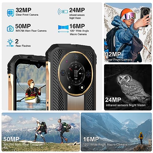 50MP KI-Dreifachkamera + 32MP Frontkamera + 2 IR-Nachtsichtlichter: Die drei Kameras dieses Outdoor-Smartphone sind wie Diamanten um das rückseitige elektronische Zifferblatt angeordnet. 50MP Hauptkamera + 24MP Nachtsicht + 16MP Ultraweitwinkel + 32MP Frontkamera für atemberaubende Fotos und Videos bei Tag und Nacht. Das S110 Android 13 Outdoor-Smartphone unterstützt HDR, KI, Profi-, Unterwasser-, Panorama-, Nachtszenenmodus und mehr. Es gibt viele verschiedene Modi zu erkunden.