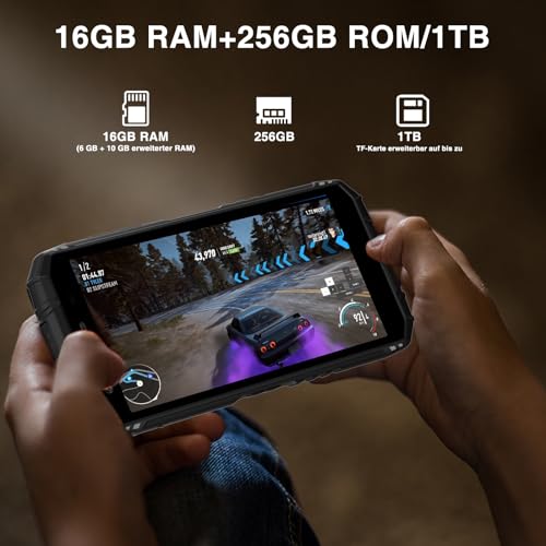 【16 (6 GB + 10 GB) GB RAM + 256 GB ROM】 DOOGEE S41 MAX Outdoor-Smartphone ist mit 16 GB RAM (6 GB fester RAM, 10 GB virtueller RAM) ausgestattet und sorgt so für ultraschnelles Herunterladen, schnelle Umsetzung. Outdoor Smartphones verfügen über die folgenden Funktionen. Ausgestattet mit 256 GB ROM und 1 TB erweiterbarem Speicherplatz bietet es Ihnen ausreichend Speicherplatz zum Herunterladen von Spielen und Dokumenten sowie zum In See stechen einer großen Anzahl von Fotos und Videos.
