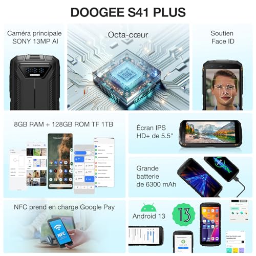 ![DOOGEE S41 Plus [2024] Handy, bruchsicher, 8 GB + 128 GB (TF 1 TB) Android 13, 6300 mAh, 5,5 Zoll IPS HD+ Display, 13 MP + 8 MP, Octa-Core Smartphone, bruchsicher, NFC/IP68/I69K/Dual SIM 4G – Bild 5](https://c.media-amazon.com/images/I/51BvnGfQhaL.jpg)