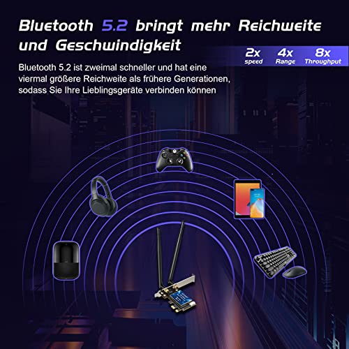 Wi-Fi 6e-Karte mit Bluetooth 5.2-Technologie: Unsere Bluetooth-Nutzung Marke NEUE 5.2-Technologie, die den Stückchen von 4 x Bluetooth-Signal erweitern, nicht kümmern, das Signal ist im All adynamisch und warten lange für den Transport der großen Dateien Neuer Bluetooth 5.2 löst dieses Problem, und es kann sich mit der Maus, Kopfhörer, Tastatur und anderen Bluetooth-Geräten verbinden (Hinweis: Sie müssen das Netzkabel in die Motherboard-9-Pin-Schnittstelle für die Bluetooth-Foto drauf setzen).