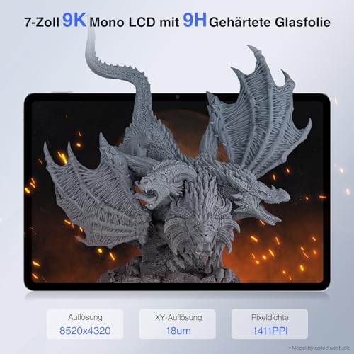 【10-Aufschlag 12K Mono LCD】Mit einem 10-Aufschlag 12K Mono LCD mit einer unglaublichen Demontage von 11520×5120 und einer XY-Demontage von 19×24μm können Sie hochdetaillierte Modelle mit erstaunlicher Klarheit und Genauigkeit drucken. Das 9H gehärtete Glas über dem LCD bietet eine ausgezeichnete Konstanz und Kratzfestigkeit und schützt den LCD-Bildschirm effektiv vor Kratzern und Schäden.