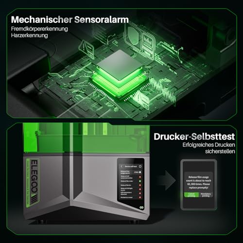 【Intelligenter mechanischer Sensor】 Qua intelligenten mechanischen Sensoren kann ELEGOO Saturn 4 Harzmangel und -rückstände ersehen, wodurch der Druckerfolg effizient verbessert und die Nutzungsdauer des Druckers verlängert wird. Darüber hinaus kann er Qua einem Klick schnell eine Selbstprüfung ausführen, um einen normalen Ausgabe sicherzustellen.