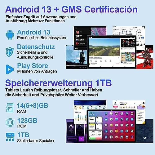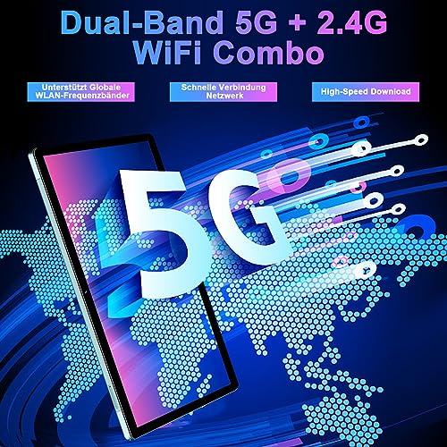 【14(6+8)GB RAM + 128GB ROM / TF 1TB & Dualband WiFi】 Das Tablet unterstützt die Verbindung mit 2,4G- und 5G-Dualband-Wi-Fi. Dualband WiFi ist für alle Heimnetzwerke angebracht und Sie können sich nach Belieben mit allen Netzwerken verbinden. 14 GB Arbeitsspeicher und 128 GB Speicherplatz, der Speicher kann auf 1TB erweitert werden, große Kapazität für die täglichen Arbeits- und Lernanforderungen, wie YouTube, Netflix, WhatsApp, Facebook, Instagram, Glovo, Fever usw.