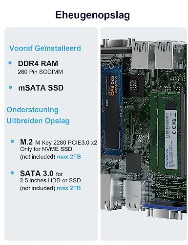 【16GB DDR4 RAM 256GB mSATA SSD Mini PC】 Vorinstalliert mit DDR4 RAM und mSATA SSD. Zwei Möglichkeiten zum Erweitern des Festplattenspeichers: Beimischen einer NVME SSD zum M.2 Steckplatz (max. 2 TB), Beimischen einer 2,5 Gebühr HDD/SSD zu SATA3.0 (max. 2 TB). Großer Speicher, erfüllt Ihre unterschiedlichen Anforderungen.