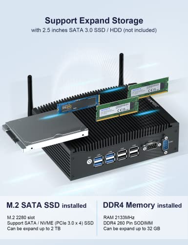 [Mini PC 8 GB RAM 256 GB SSD installiert] –> DDR4 RAM sorgt dafür, dass der Mini Computer eine schnellere Geschwindigkeit und höhere Leistung, zuverlässigere Daten und mehr Energieeinsparung hat. M.2 SATA SSD, Datenübertragungsrate bis zu 6 Gbps, drei bis vierfache Bandbreite von HDDs, perfekter Ersatz für 2,5 Abgabe SSD.